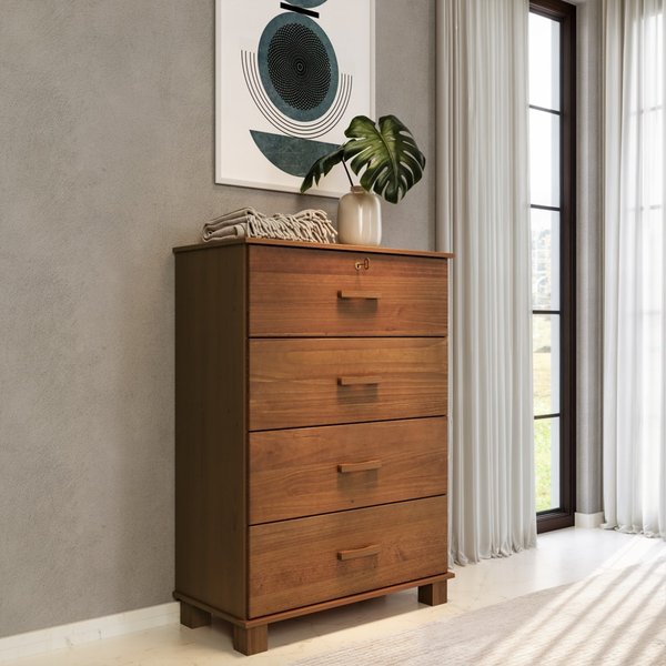 A Linha Bronze reflete em seu design versatilidade e pesonalidade. Seu alto padrão de qualidade une com criatividade charme rústico, beleza e durabilidade na medida certa para transmitir grandeza ao ambiente. A Cômoda 4 gavetas é feita de Madeira Maciça. O acabamento é com pintura acetinada em Verniz PU e UV, na cor Castanho.