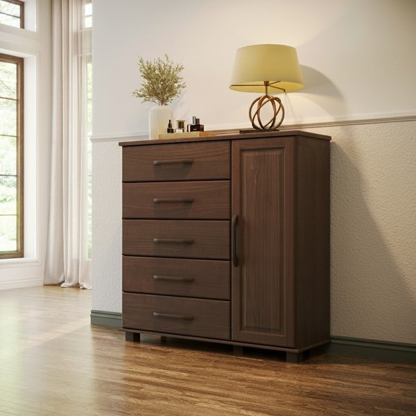 Um design clássico traz para o ambiente detalhes e qualidade além do imaginável. Uma beleza excepcional aliada a altos padrões de elegância e resistência, transmitem o melhor que a Linha Ouro pode oferecer. A Cômoda 5 Gavetas e 1 Porta da Linha Ouro é feita 100% de madeira maciça, assim como os demais produtos da Linha. O acabamento é em Verniz Acetinado PU e UV, na cor Café. Além da qualidade e durabilidade que a madeira proporciona, o produto oferece amplo espaço interno para organização de roupas, itens de uso pessoal e diário, gerando praticidade, além do tampo para acomodar itens decorativos, tornando-se uma peça indispensável para seu quarto.