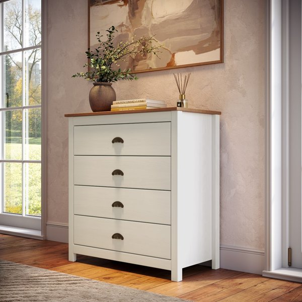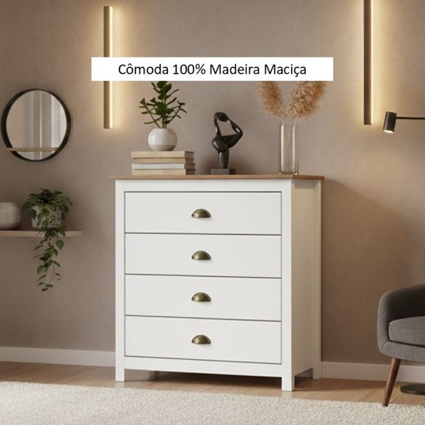 A Cômoda 4 Gavetas da Linha Topázio - Finestra Móveis é 100% de madeira maciça, garantindo além da beleza, sua durabilidade. Os pés e a estrutura são na cor Branco Lavado e o tampo, na cor Freijó, combinando com sutileza e realçando os detalhes únicos da madeira.