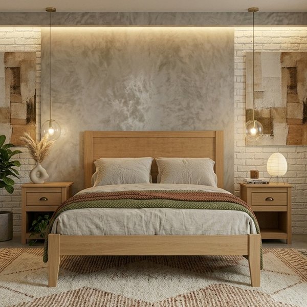O conjunto é formado por 1 Cama Casal 1,40mt e 2 Mesas de Cabeceira, criando um ambiente equilibrado, funcional e visualmente sofisticado.