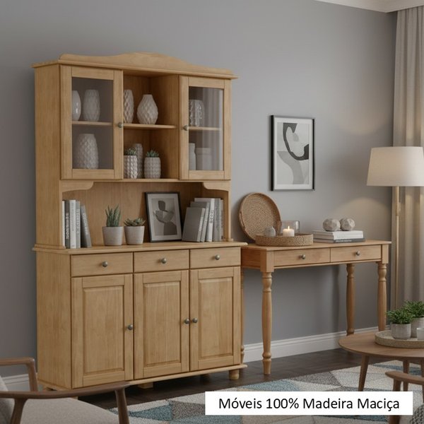 A cristaleira possui 5 portas (2 com vidro), ideal para exibir louças e objetos com elegância.