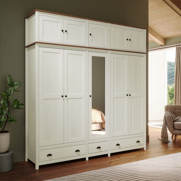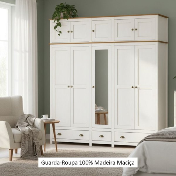 O Guarda Roupa 10 Portas e 3 Gavetas da Linha Topázio, assim como os demais produtos da linha, é produzido 100% de madeira maciça de pinus de reflorestamento. Os pés, estrutura, divisórias internas e o tampo são na cor Freijó, destacando a cor e detalhes característicos da madeira. O produto possui 10 Portas e 3 Gavetas, oferecendo um ótimo espaço interno.