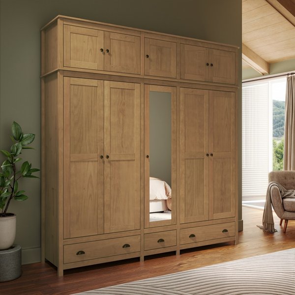 O Guarda Roupa 10 Portas e 3 Gavetas da Linha Topázio, assim como os demais produtos da linha, é produzido 100% de madeira maciça de pinus de reflorestamento. Os pés, estrutura, divisórias internas e o tampo são na cor Freijó, destacando a cor e detalhes característicos da madeira. O produto possui 10 Portas e 3 Gavetas, oferecendo um ótimo espaço interno.