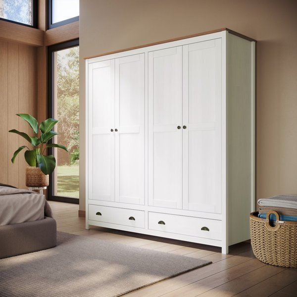 O Guarda Roupa 4 Portas e 2 Gavetas da Linha Topázio- Finestra Móveis, assim como os demais produtos da linha, é produzido 100% de madeira maciça de pinus de reflorestamento. Os pés, a estrutura e divisórias internas são na cor Branco Lavado, e o tampo, na cor Freijó, destacando a cor e detalhes característicos da madeira. O produto possui 4 Portas e 2 Gavetas, oferecendo um ótimo espaço interno.