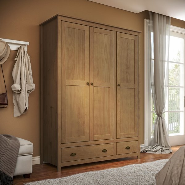 O Guarda Roupa 3 Portas e 2 Gavetas da Linha Topázio, assim como os demais produtos da linha, é produzido 100% de madeira maciça de pinus de reflorestamento. Os pés, estrutura, divisórias internas e o tampo são na cor Freijó, destacando a cor e detalhes característicos da madeira. O produto possui 3 Portas e 2 Gavetas, oferecendo um ótimo espaço interno.