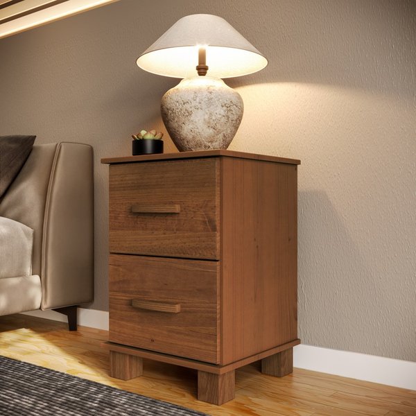 A Linha Bronze reflete em seu design versatilidade e pesonalidade. Seu alto padrão de qualidade une com criatividade charme rústico, beleza e durabilidade na medida certa para transmitir grandeza ao ambiente. A Mesa de Cabeceira 2 Gavetas é feita de Madeira Maciça. O acabamento é com pintura acetinada em Verniz PU e UV, na cor Castanho.