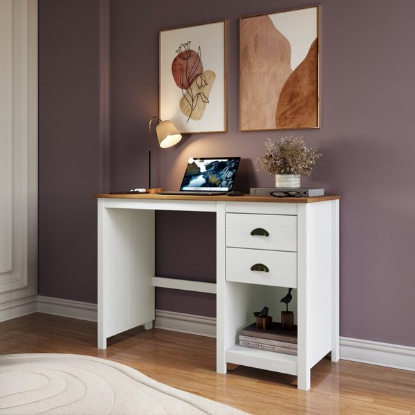 A Escrivaninha 2 Gavetas da Linha Topázio - Finestra Móveis, assim como os demais produtos da linha, é feita 100% de madeira maciça. Além da qualidade do seu material, possui design contemporâneo trazendo modernidade ao ambiente. A estrutura é em Branco Lavado e o tampo é na cor Freijó, realçando os detalhes únicos da madeira.