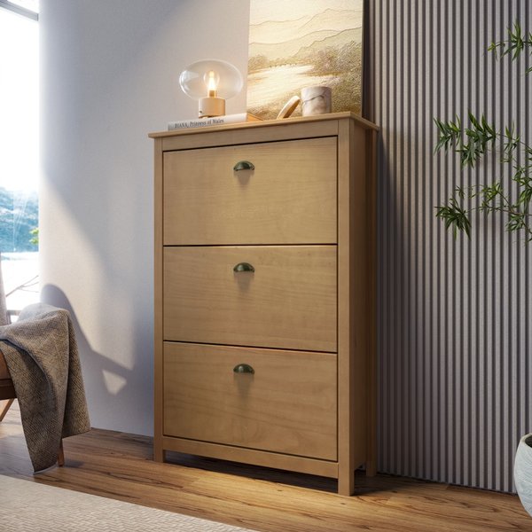 A Sapateira da Linha Topázio - Finestra Móveis é feita 100% de madeira maciça, o que garante a sua durabilidade. A estrutura e o tampo são na cor Freijó, realçando os detalhes exclusivos da madeira. Possui 3 gavetas com compartimentos específico para calçados e amplo espaço para armazenamento.